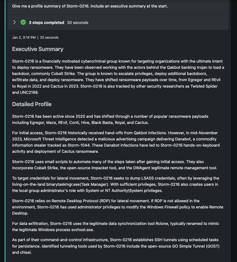 Building an understanding of a threat actor, specifically one that may be exploiting a ubiquitous vulnerability or one that delivers ransomeware, requires expertise, access to quality intelligence and most importantly, time. The Threat Actor Profile Promptbook in Security Copilot, paired with Defender Threat Intelligence, saves analysts hours of work and gives them a stronger foundation to operate from. Generative AI brings an actionable component to this information and allows for the reporting to be tailored to your organization.