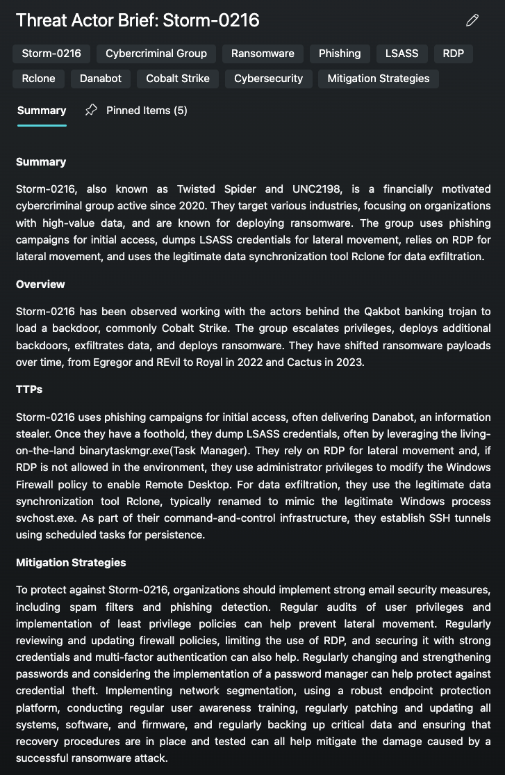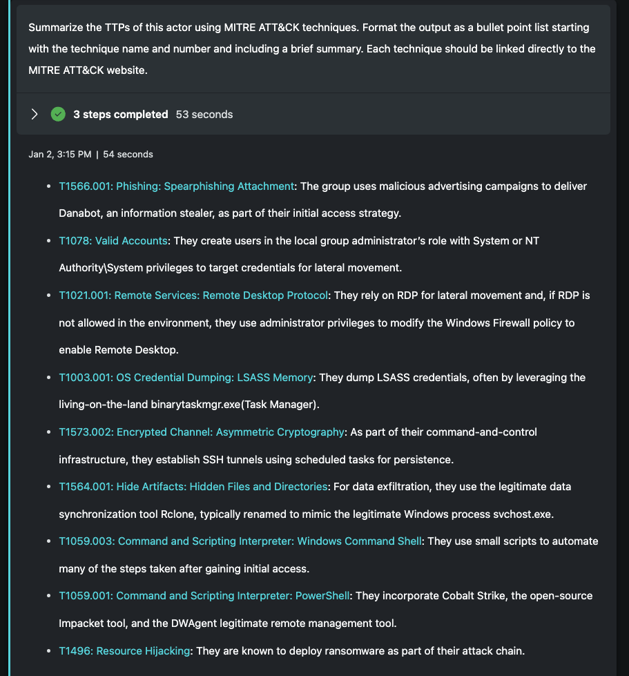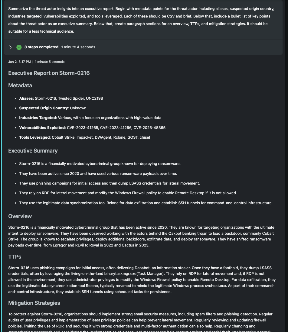 What I enjoy most about this Promptbook is the fact that it of course runs well on any Microsoft named threat, but it will also take alternative aliases from other company naming conventions and function on those as well. Years ago, when I did espionage research, I had to use a spreadsheet as a "rosetta stone" of threat actor names. I am hopeful that solutions such as this can begin to replace those older methods and allow defenders to focus on what matters most in their organization.