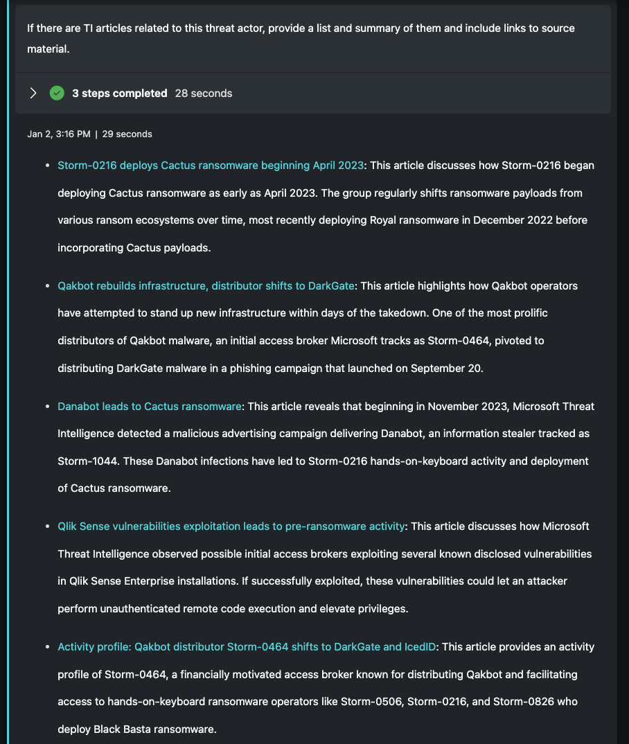 This prompt performs a basic look-up within the database of curated and OSINT aggregated intelligence from Microsoft Defender Threat Intelligence. The prompt is simple and to the point. Provide any articles that include the threat actor references and summarize them with links. Those with limited understanding of the actor can quickly browse recent reporting with the option to dive further into the details of each case. As indicated in the final bullet point, there's mention of several other related ransomware threat actors including Storm-0464, Storm-0506, and Storm-0826. These are all great candidates to run back through this same Promptbook to further our understanding of a broader ransomware ecosystem.