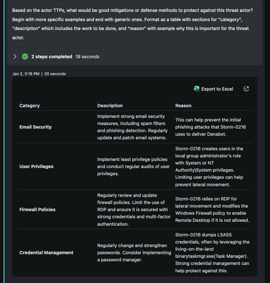 In this prompt, I shift back to more of a detailed prompt. Using the previous context formed from our broader session, I have Security Copilot outline mitigations and defense methods, starting with more specific first and ending with generic. This instruction is more open given the nature of the Promptbook, though could be tuned to an organization by incorporating technology leveraged or specific control-points of interest. I've instructed to focus on specific to generic as I've observed the model will often mix the both and while the generic is useful, it's not always the most actionable.